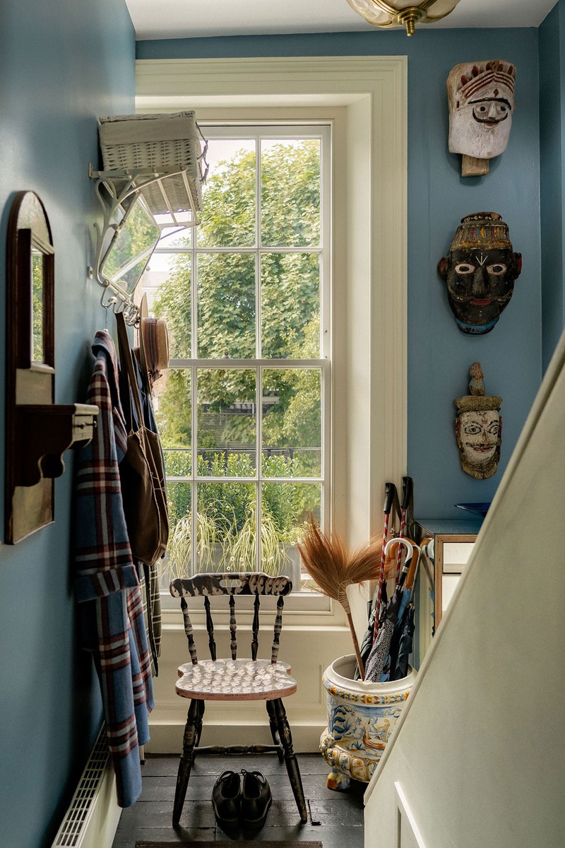 I included a chair decorated by my sister, interior designer Leo Wood, and I’ve layered in a mix of characterful objects: South Asian decorative masks I picked up at auction and a wooden key stand that belonged to my mum. These pieces bring personality and warmth to the entrance, making it feel stylish yet lived-in, while complementing the overall design.