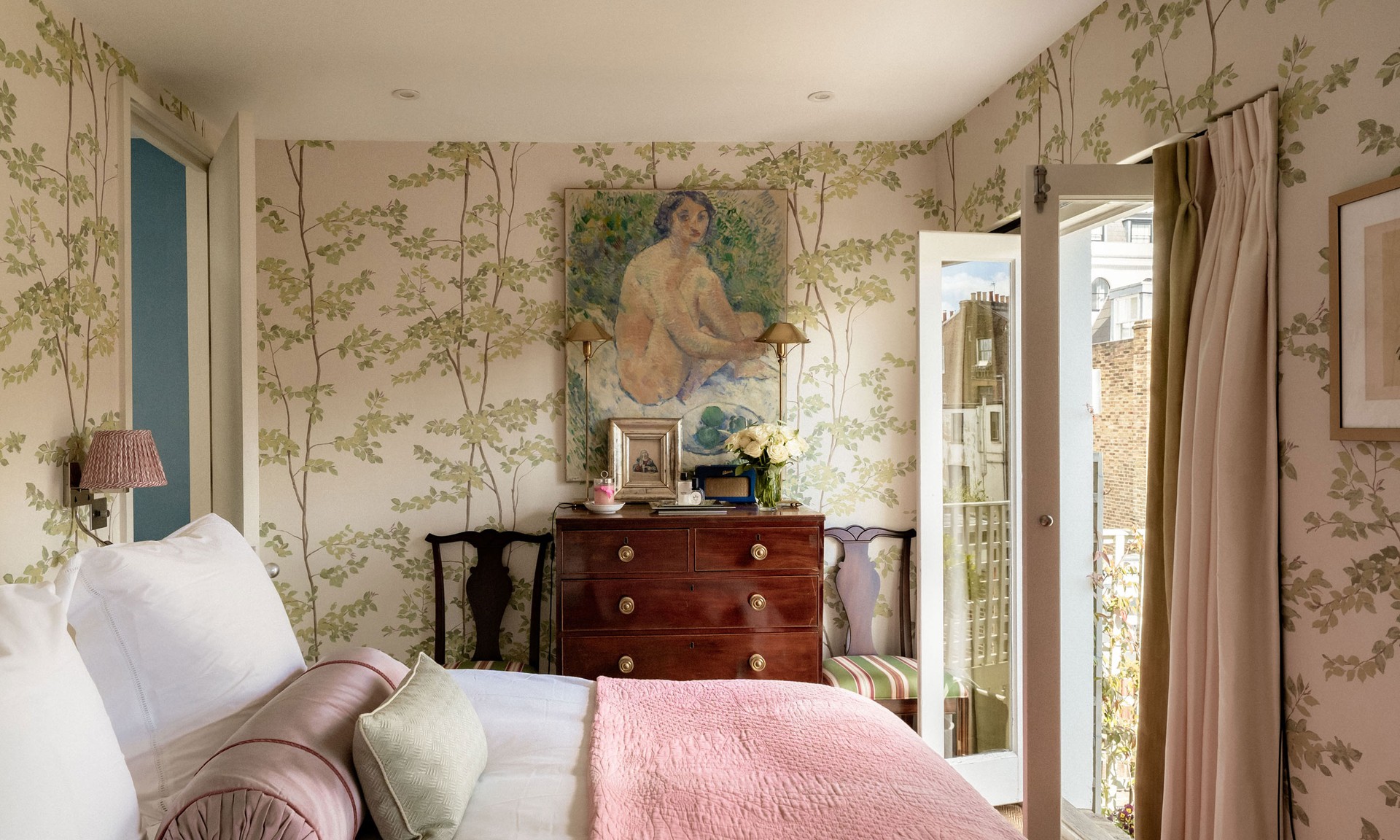I brought in pieces from my childhood bedroom to make the room feel personal and layered. A chest of drawers and a nursing chair were re-covered in silk, adding both comfort and charm. Above the chest, I left a rather fantastic large nude that I bought at Drewetts unframed – it feels more modern that way – while the overall mix of objects and textures helps give the room a relaxed, slightly whimsical character that ties in with the outdoor terrace.