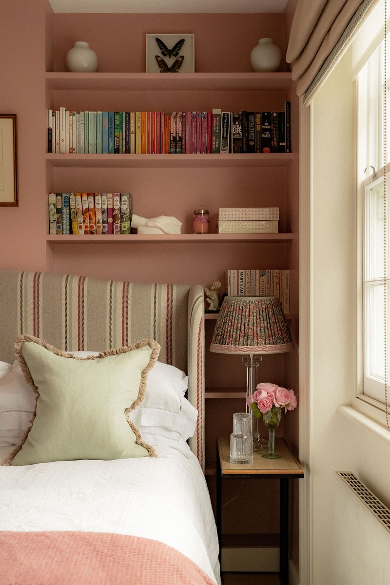 With French windows opening onto a small terrace, this space could have been tricky to style but I decided to embrace that secret-garden feel. I wanted to create a woodland-bower vibe, which felt just right, especially since the sun rises on this side of the house. To keep costs down, I left the existing floor-to-ceiling joinery in place, then added a simple architectural trim and accessorised it with interesting knobs. Space-saving touches include wall-mounted bedside reading lights and a pair of petite tables from Sunbury Antiques Market.