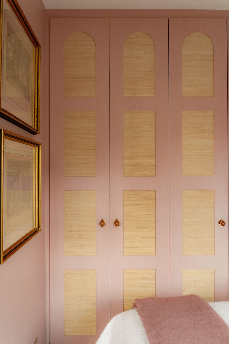 When I first saw it, I think I described this room as having “the worst feng shui ever”, so it definitely needed a clever approach. Before, a cupboard sat where the bedhead is now, which made the layout feel really cramped and awkward. I had my joiner build a simple wardrobe, and we inset the doors with offcuts of wallpaper that gives the look of rattan, adding texture and softness. The combination of the headboard fabric and the wall colour keep the room warm and calming.