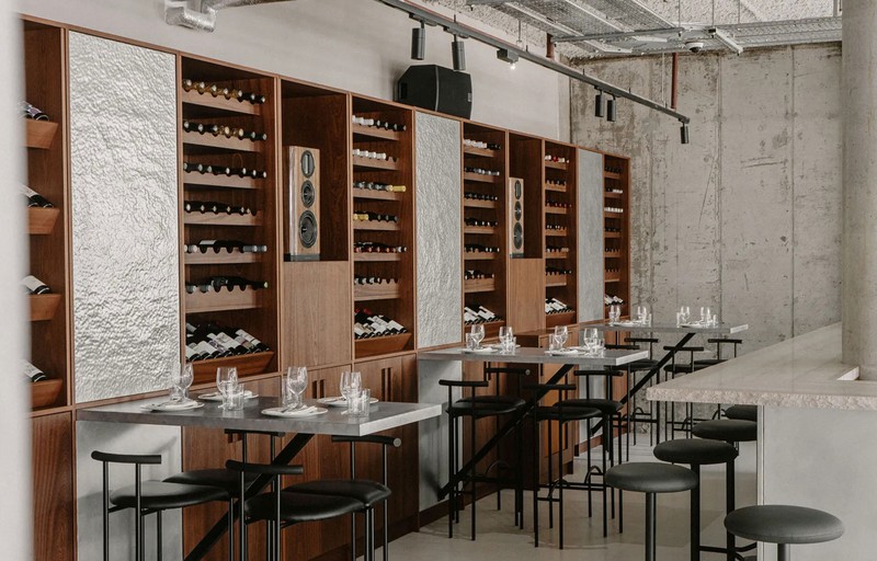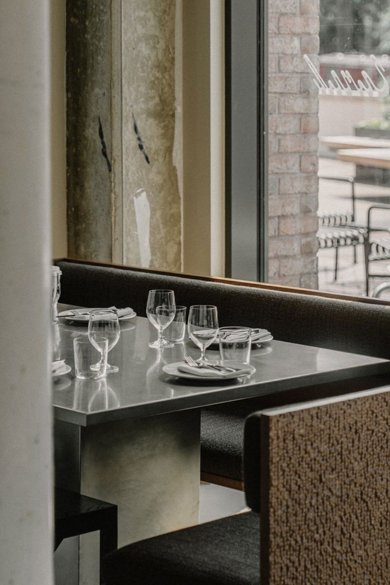Designed by A-nrd, the interiors centre on a sculptural zinc-clad island bar crowned with creamy live-edge stone, creating a striking focal point echoed in hammered zinc shelving and warm Sapele wood. Custom beech banquettes and communal tables introduce texture and sociability beneath the raw ceiling grid, while a glazed timber canopy frames the open kitchen, offering subtle theatre without disrupting the calm.