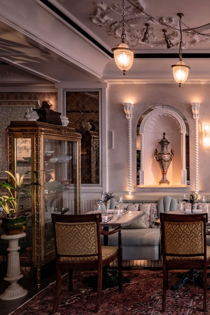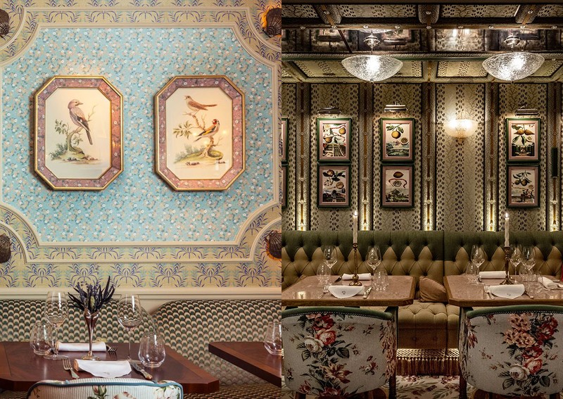 Rooted in an elegantly eclectic English town-and-country aesthetic, the material palette is deliberately rich. A variety of elegant materials and finishes were used, from versatile panels to inlaid marble on the floor, as well as chintz, leathers and silks on the furniture and walls. Russell Sage Studio’s attention to detail is clear throughout, with hand-painted motifs around the room and in the bathrooms – something quite different for the Mayfair dining scene.
