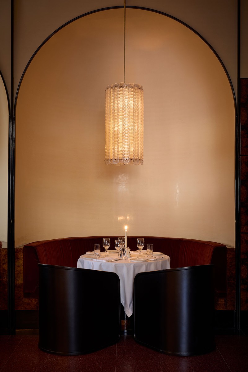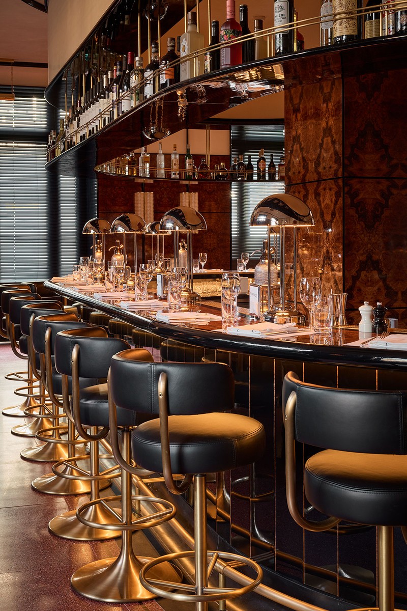Italian craftsmanship continues in the details, from Murano glass wall lights to a sculptural central bar wrapped in dark timber and brass. Above it, a glowing canopy of bottles forms a striking focal point. For restaurateur Martin Kuczmarski, it is the finishing touches – music, table settings and candlelight – that complete the room’s quietly luxurious mood.