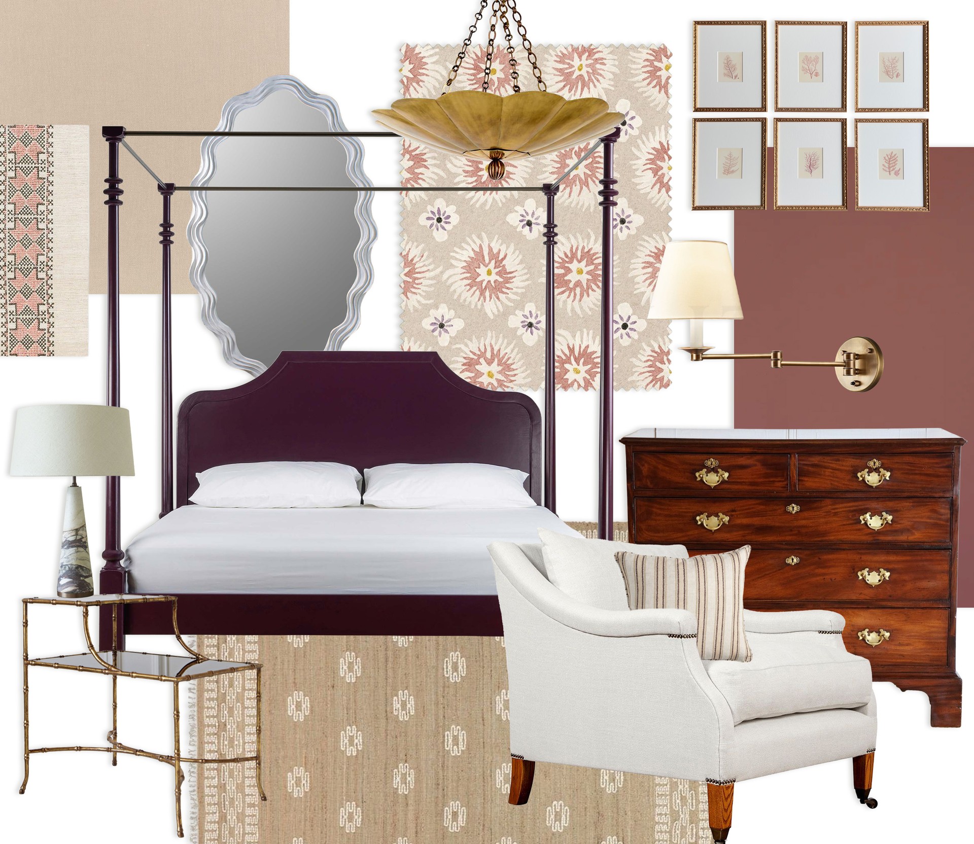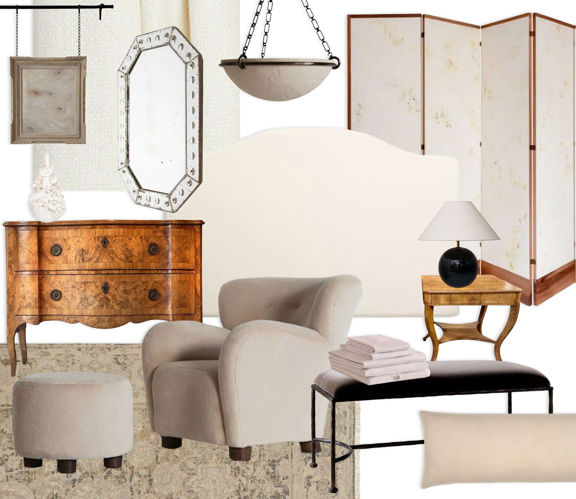 A bedroom is, above all, a place to relax and restore. This scheme has been shaped around a quiet sense of calm and understated elegance, layered with texture and detail to create interest without ever overwhelming the space. Antique pieces ground the room in history, while marble and brass introduce a sense of sophistication. Softer elements, like the gentle lines of the pendant and the fluid form of the mirror, bring lightness and femininity. Natural linen curtains, finished with a delicate embroidered edge, enhance this softness, adding depth through fine detailing.