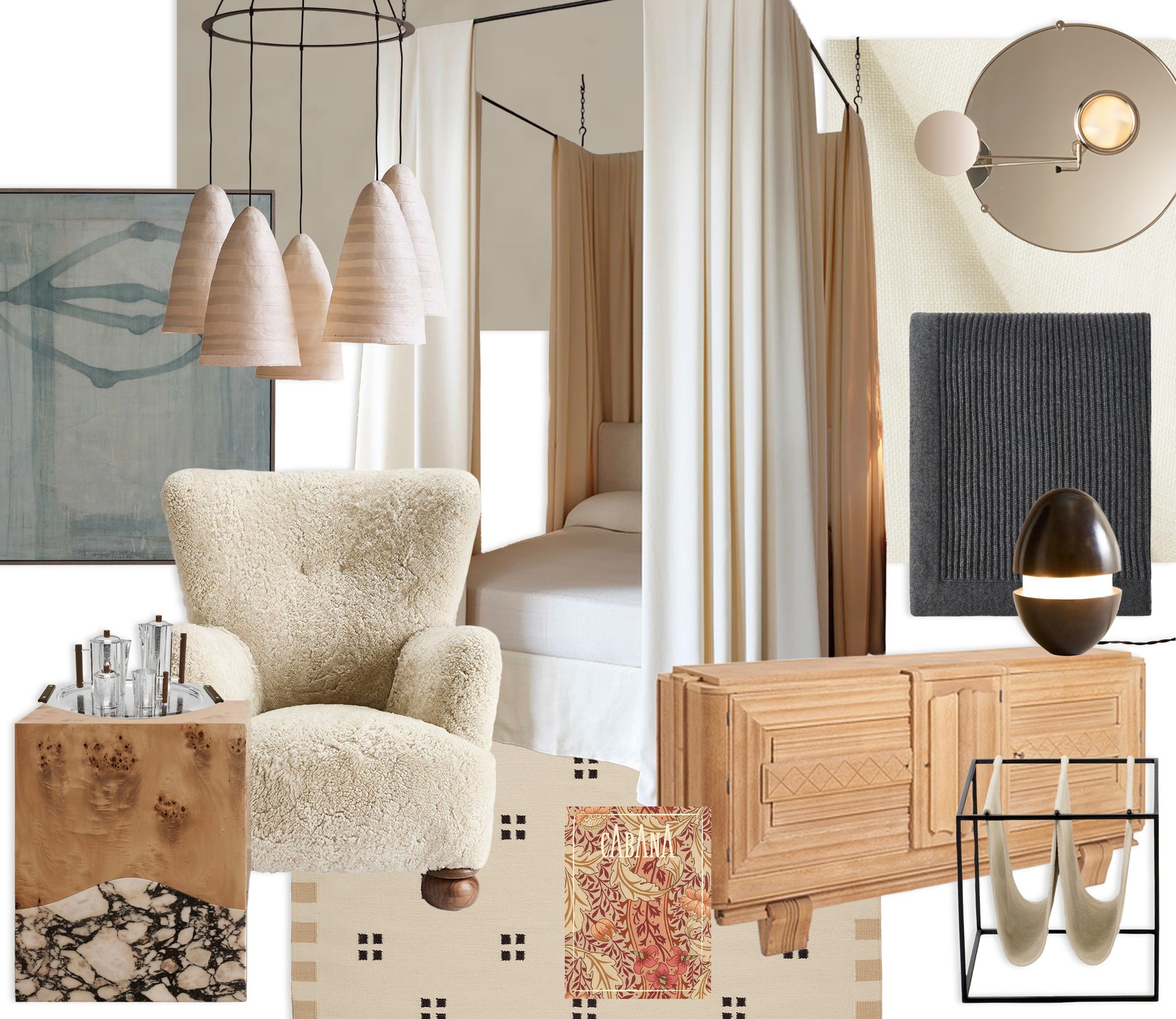 The philosophy behind this bedroom scheme lies in the balance between contemporary restraint and characterful detailing. Neutral, modern pieces are layered with stronger accents and curated vintage elements, such as the Art Deco silver plated coffee set and the oak sideboard to create depth. The bespoke Cinque Terre side tables in burr timber and Calacatta Viola with the antique brass egg table lamp introduce richness and material contrast, while the limewash walls add a subtle interplay of texture; this calm backdrop allows for moments of colour (like the Gallery M.A.H artwork) to stand out. The canopy bed and teddy armchair were selected to enhance a sense of comfort and quiet elegance, making the room feel inviting and composed. Stronger finishes, including marble and metal, are balanced by crisp white bed linen (by under) and simple white Roman blinds, ensuring the overall atmosphere remains light.