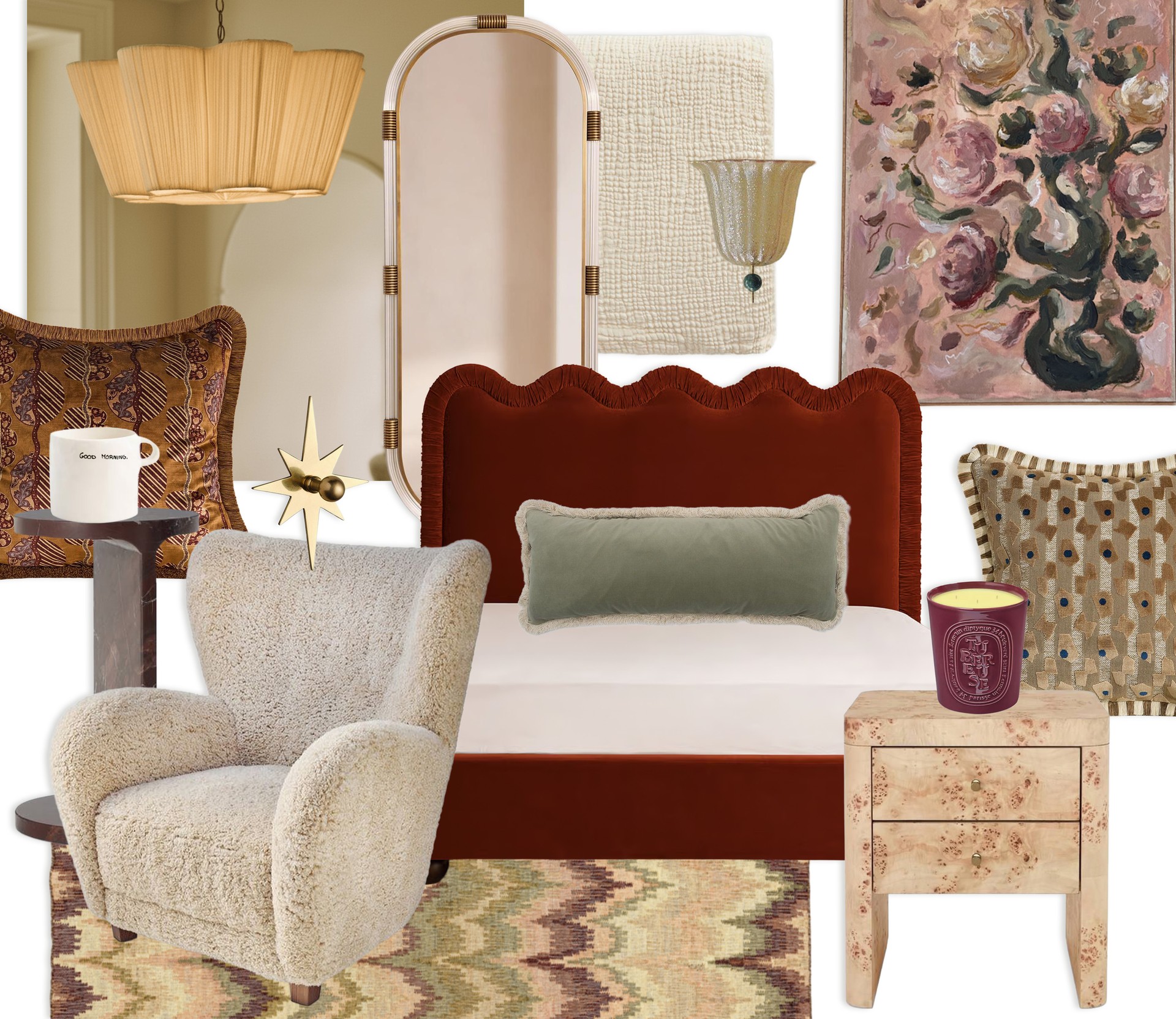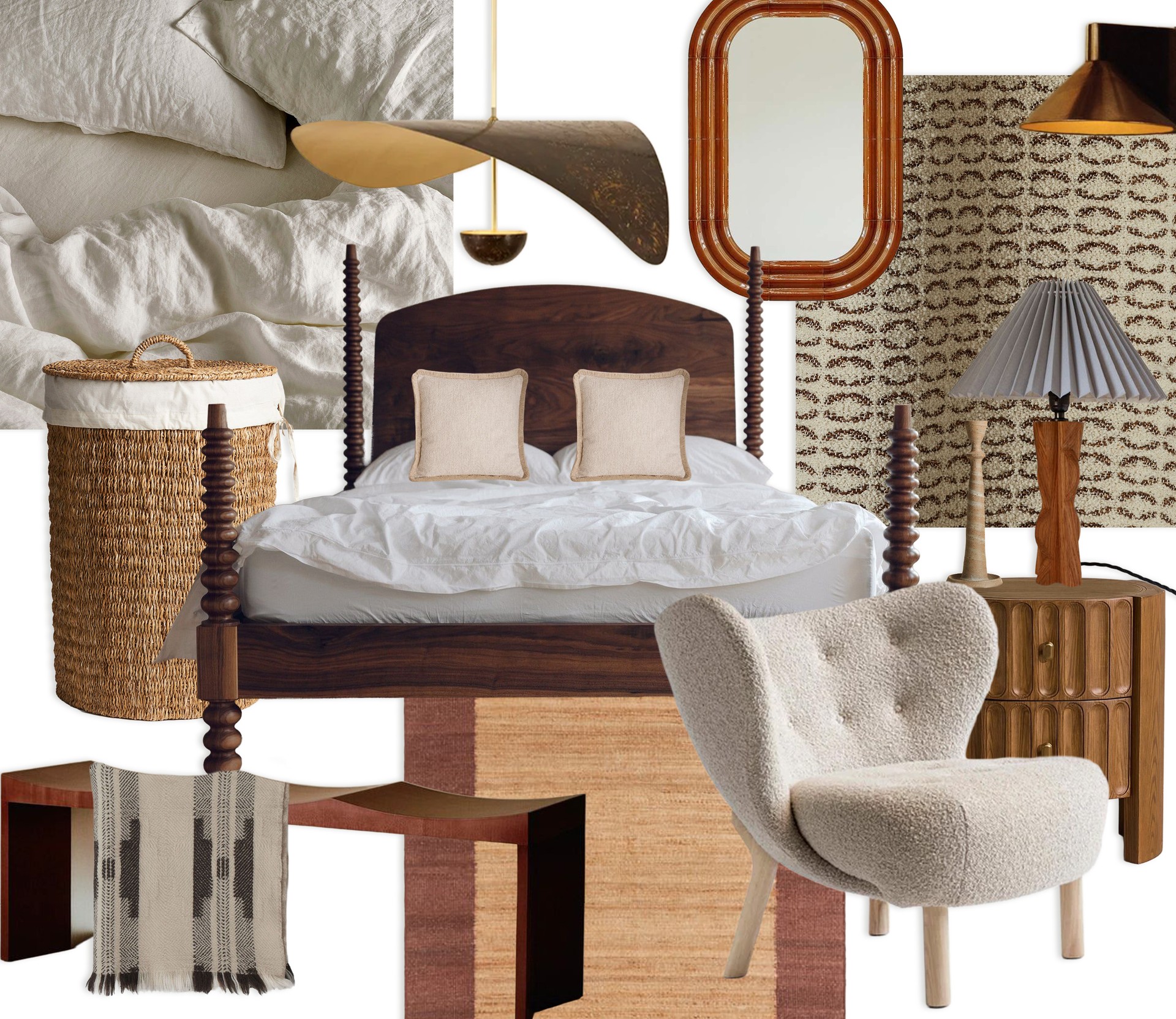 This bedroom scheme focuses on warmth, texture and that lovely balance between softness and structure. I wanted it to feel grounded and cocooning, so I’ve mixed warm oak, earthy textiles and darker, more sculptural elements to create a space that feels calm but never flat. The timber pieces bring a sense of craft and quiet warmth, while the lighting and accent pieces give the room depth. Clay-toned linen, woven cushions and a wool throw keep everything feeling easy, relaxed and inviting – the kind of bed you want to fall straight into. The jute rug and curtain fabric add autumnal warmth, while the artwork brings a note of richness and soul. The result is a bedroom that feels calm and considered but still full of personality – a place to hunker down and switch off.