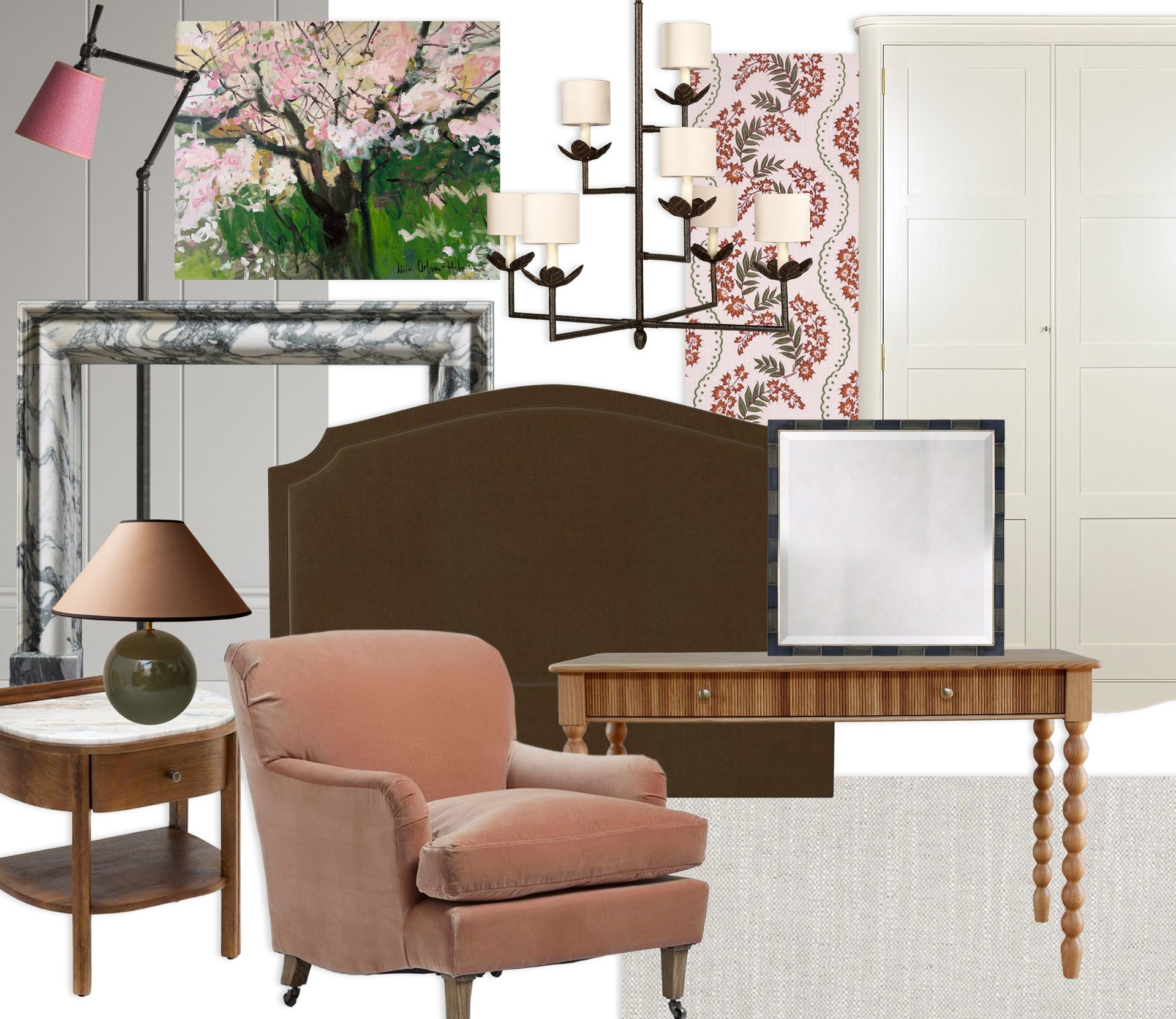 In this country house scheme, the goal was to craft a space where unapologetic luxury met lived-in comfort. The colour palette is anchored by a deep chocolate velvet headboard, providing a grounded, sculptural focal point that feels both timeless and modern. By blending contemporary silhouettes, like the blackened-bronze branch chandelier, with the warmth of bobbin-leg wood tones and marble accents, the space feels as though it has been thoughtfully curated over time. The success of the scheme lies in its rich layering of textures. This mix of materials creates a visually engaging yet peaceful atmosphere, ensuring the bedroom is not just a place to sleep but a tactile and inviting retreat that balances high-end style with essential functionality.
