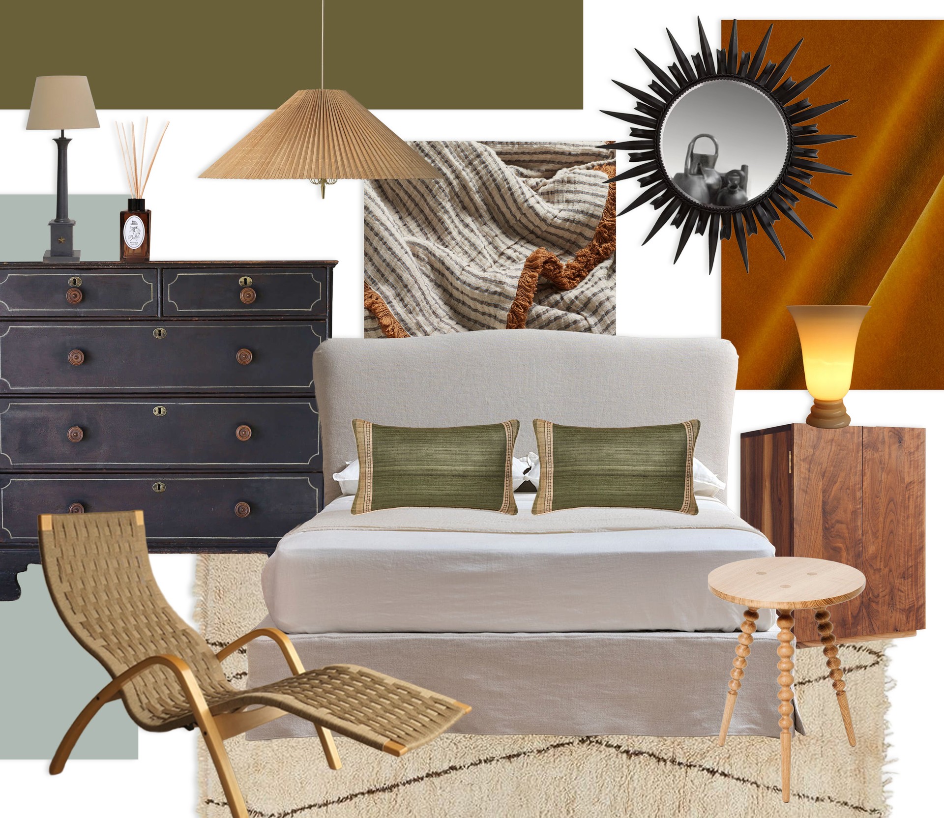 This bedroom scheme focuses on warmth, texture and that lovely balance between softness and structure. I wanted it to feel grounded and cocooning, so I’ve mixed warm oak, earthy textiles and darker, more sculptural elements to create a space that feels calm but never flat. The timber pieces bring a sense of craft and quiet warmth, while the lighting and accent pieces give the room depth. Clay-toned linen, woven cushions and a wool throw keep everything feeling easy, relaxed and inviting – the kind of bed you want to fall straight into. The jute rug and curtain fabric add autumnal warmth, while the artwork brings a note of richness and soul. The result is a bedroom that feels calm and considered but still full of personality – a place to hunker down and switch off.