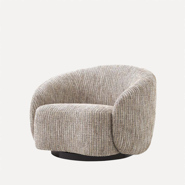 “This moodboard was designed for a sophisticated client with a fast-paced, urban lifestyle who values clean lines, subtle luxury and a restful, retreat-like atmosphere. Our approach to this space within a modern city-centre apartment balances sleek, uncluttered design with touches that bring warmth, texture and playful character. For instance, the luxurious sheepskin upholstered clam chair and the lambswool-cashmere patterned throw introduce a soft, tactile warmth that encourages relaxation. At the room's focal point is a wavy headboard upholstered in a chic striped fabric, paired with circular legs for a fun, unique twist on the traditional bed frame.