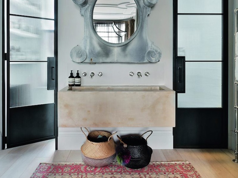 Opaque glass is a great option in bathrooms where privacy is paramount, but window treatments are not necessarily practical. Here Tiffany Duggan of Studio Duggan has used beautiful graphic framed panel doors between a bathroom and bedroom.