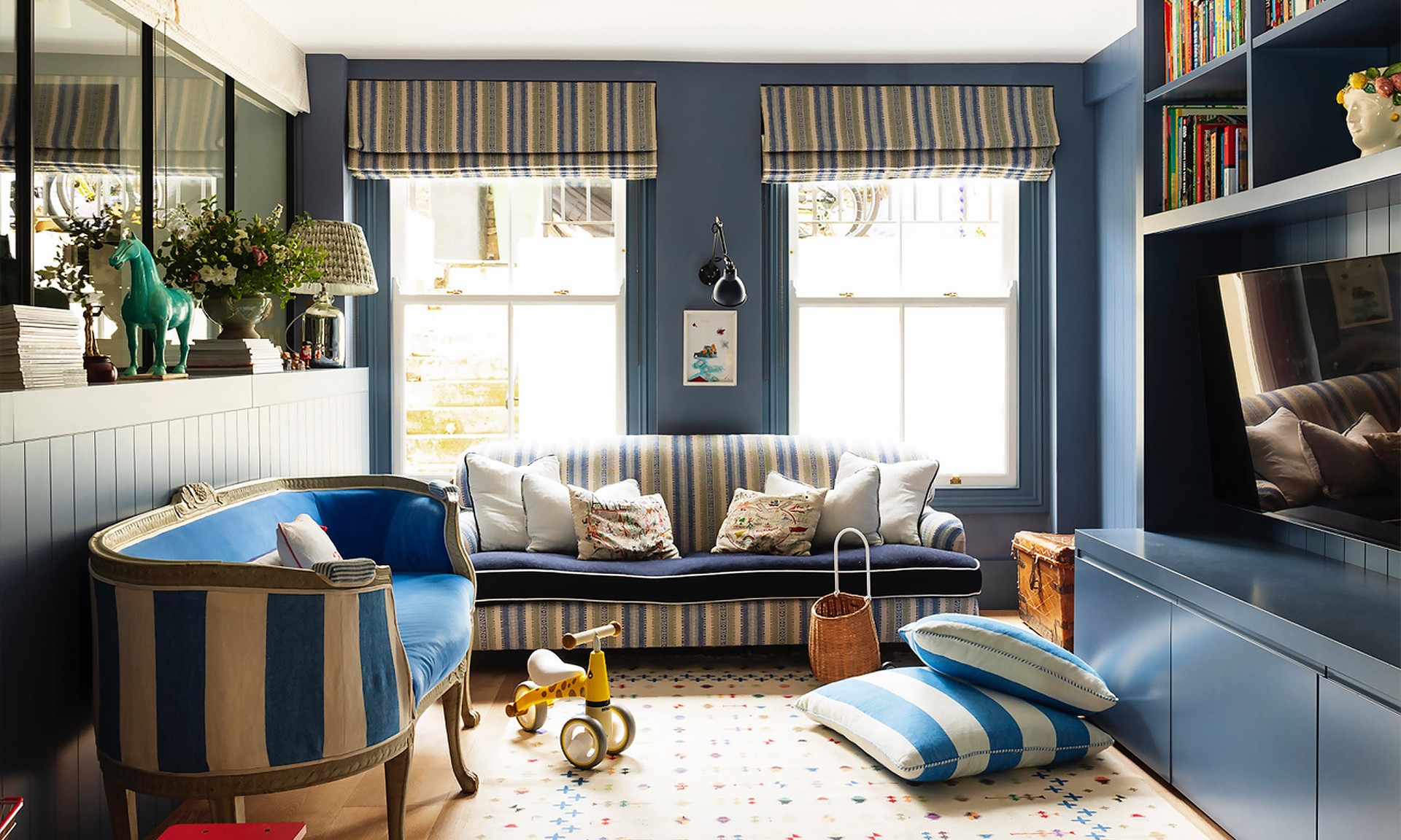 I knew this was a dark corner in the house, so I didn’t want to try and hide it away any more. I wanted to embrace it and play with a different blue from Edward Bulmer. As I’ve mentioned, wood always makes a room feel warmer, and I’ve always loved the idea of using tongue and grove, so I combined the two in the joinery in here. Once my children are older and the toys start to disappear, I want to buy a sofa that goes the whole way around the room so they can hang out with their friends and watch TV.