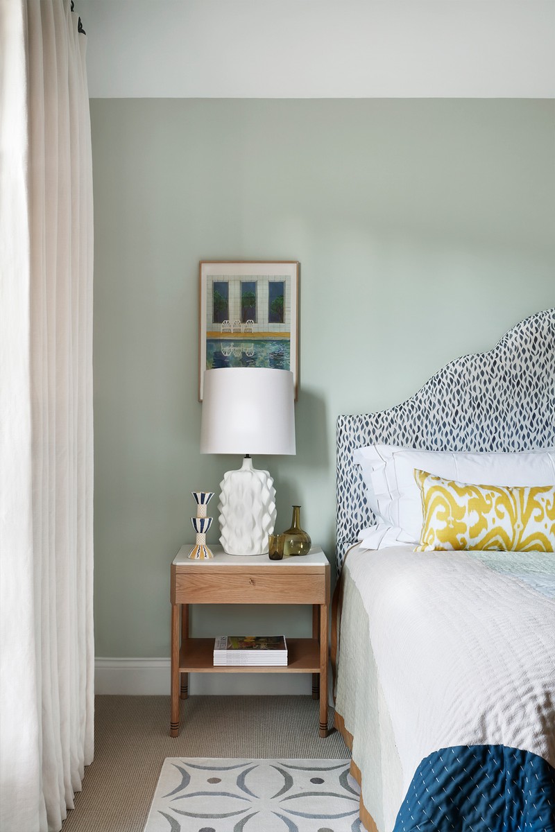 In the master bedroom, we wanted to keep the colour palette calm and introduce soft colours. Edward Bulmer ‘Celadon’ works beautifully with the oak window frames. The Vanderhurd rug was another early find which drew in some cool blues into the scheme. To maintain the calm feeling we were conservative with pattern and kept the large swathes of wall and curtain fabric plain – using pattern on smaller areas like the headboard and cushions.
