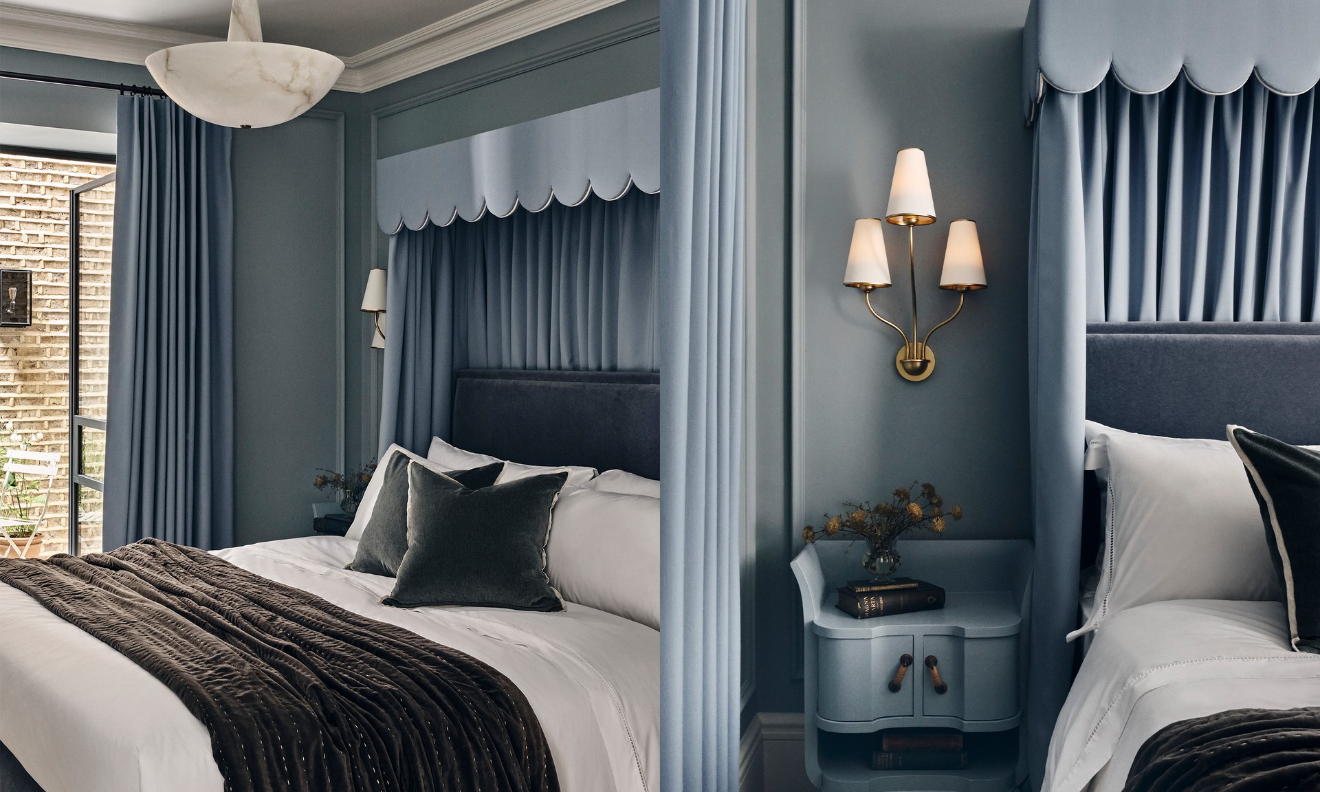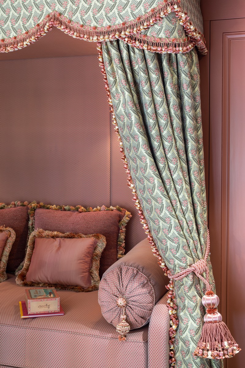 “When placed above a bed, the effect is ornamental, as the curtain is not built to run on its rails but is purely designed to adorn the head of a bed and provide an enclosed, cosy feeling. It gives you that canopy effect and evokes the feeling of a four-poster bed in a more decorative style. Above-bed pelmets add height and elegance, as well as a focal point for a room. Making the pelmet slightly shorter than the width of the bed allows the curtains to drape organically, resulting in a soft, feminine effect. Solid box pelmets are structured in shape and offer a more contemporary effect, whilst a soft pelmet is more relaxed, and tends to be adorned with trims and ruffles, creating a more opulent period look.” – Jo