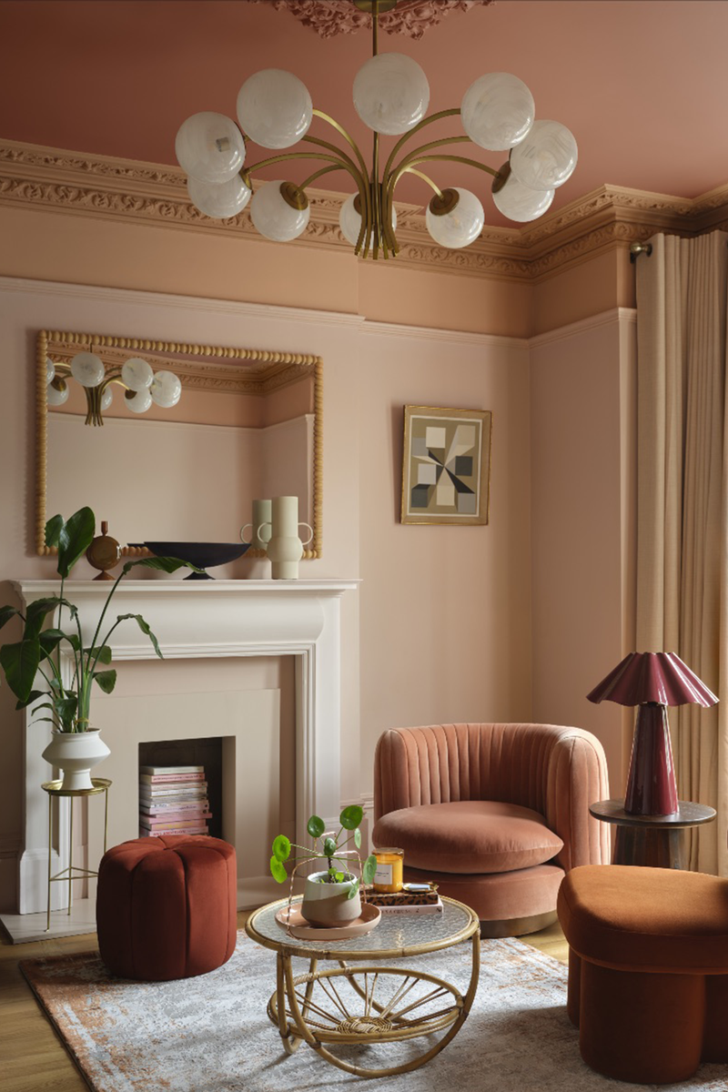 “As colour capping works with tones from the same colour family, the risk of clashing is low, so whether you’re a minimalist or after a bolder look, this technique can work for you. Even in a palette of neutrals, colour capping can elevate a space. An off-white wall colour like a creamy beige capped with a slightly more saturated pinky-orange neutral, gently draws attention to the ceiling. Keep the rest of the scheme simple so as not to distract from the main focal point.