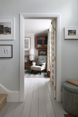 We continued the entrance hall all the way up the stairs to the landing. Portobello Painters’ French polisher worked his magic on the handrail, and we painted the architraves and doors in Edward Bulmer’s Celadon paint. Outside the bathroom door, on the half-landing, there’s another antique chair below a painting by Sarah Balme. The chandelier is a mid-century find from Pamono and the white lamp is from Porta Romana.