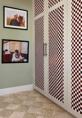 We changed the layout around to put the bed on the smaller wall and added built-in wardrobes on the wider wall. Again, storage was really important, and we wanted the bed to feel cosy while still allowing for two bedside tables. The wardrobe borders are painted in French Grey Pale by Little Greene and the inset panels are made up of a hand-painted chequerboard design. Because the bed is such a large feature, we wanted the wardrobes to balance the room out a bit. The whole scheme is based around nature, so we went for a deep red/brown colour which we hand mixed ourselves. It took two of us a solid week to draw out and paint the whole thing!