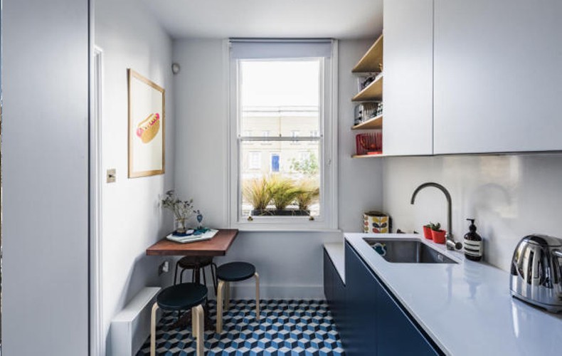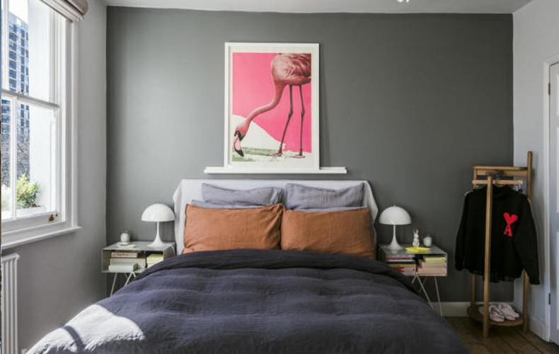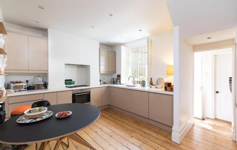 This three-bedroom maisonette sits on the upper floors of an elegant Victorian terrace in De Beauvoir. Geometric concrete floor tiles lead through the hallway into the kitchen, fitted with minimal cupboards in midnight blue and white. We like the light-filled double living room, with sash windows which look over the gardens at either end. The hallway conceals plenty of storage with above head-height bookshelves, plus a discreet shoe collection storage under the stairs. Stripped floorboards and natural wood doors feature throughout the house. Upstairs you’ll find three bedrooms and a pale pink family bathroom that was inspired by a trip to Paris. There’s also a well-maintained garden, planted with white hellebores, camelias, hydrangeas, clematises and roses.
