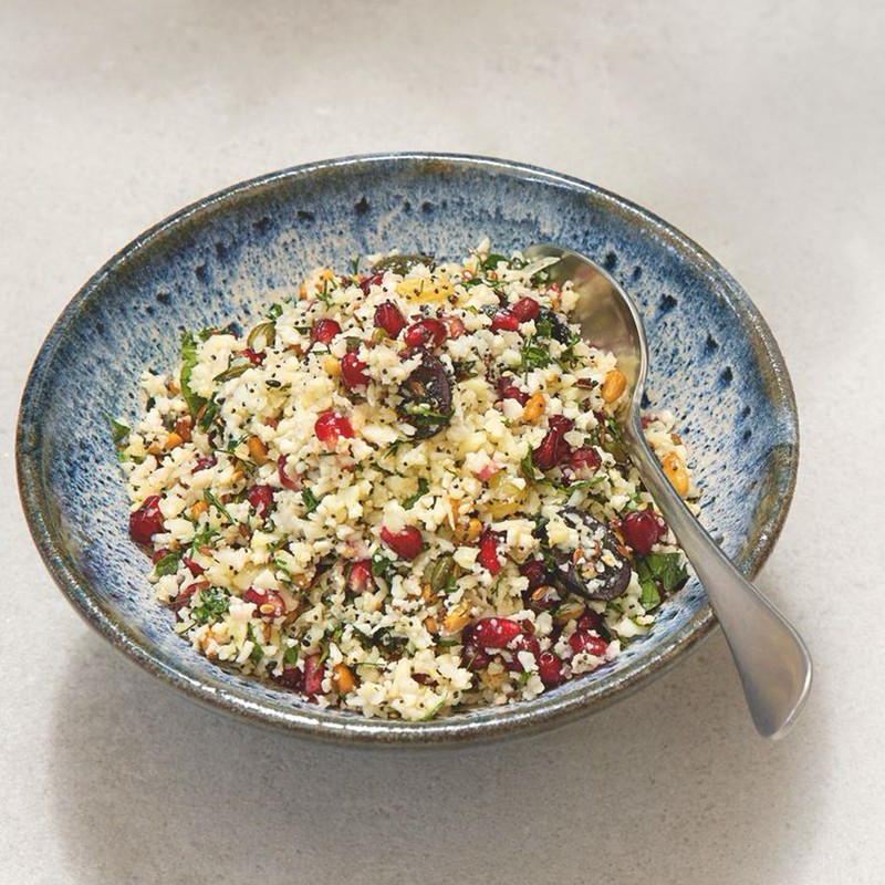 Blend the cauliflower in a food processor until the texture resembles couscous. Transfer to a mixing bowl and season lightly with salt.