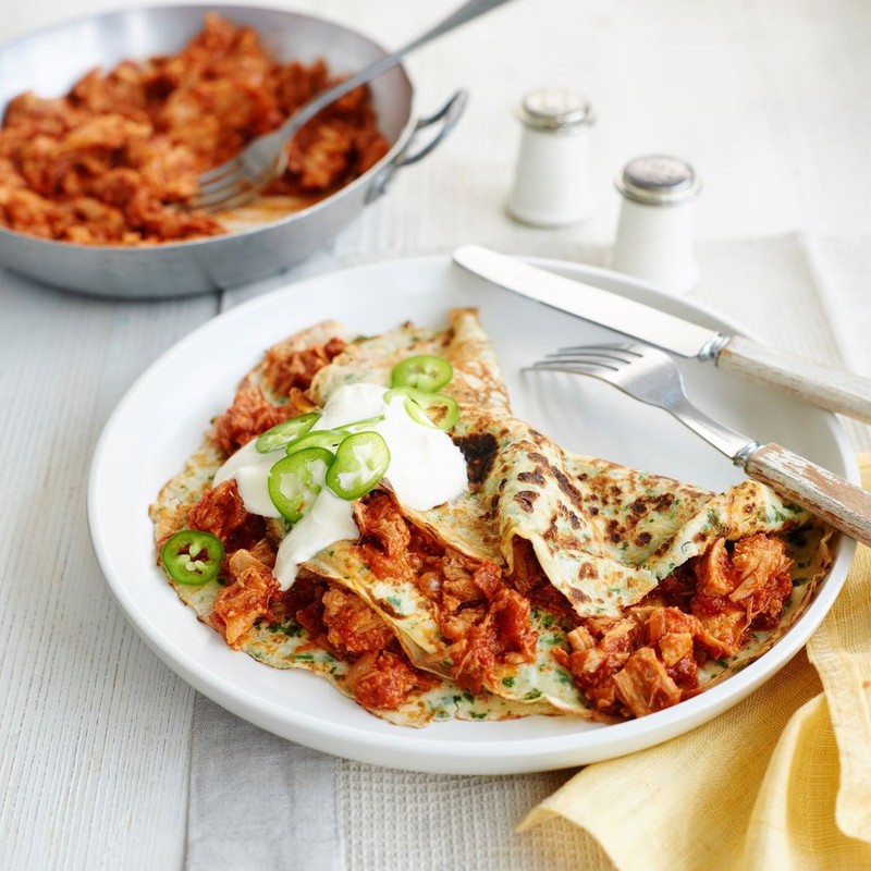 Shred the pork with two forks. Spoon the filling into the pancakes, and top with soured cream and chilli.