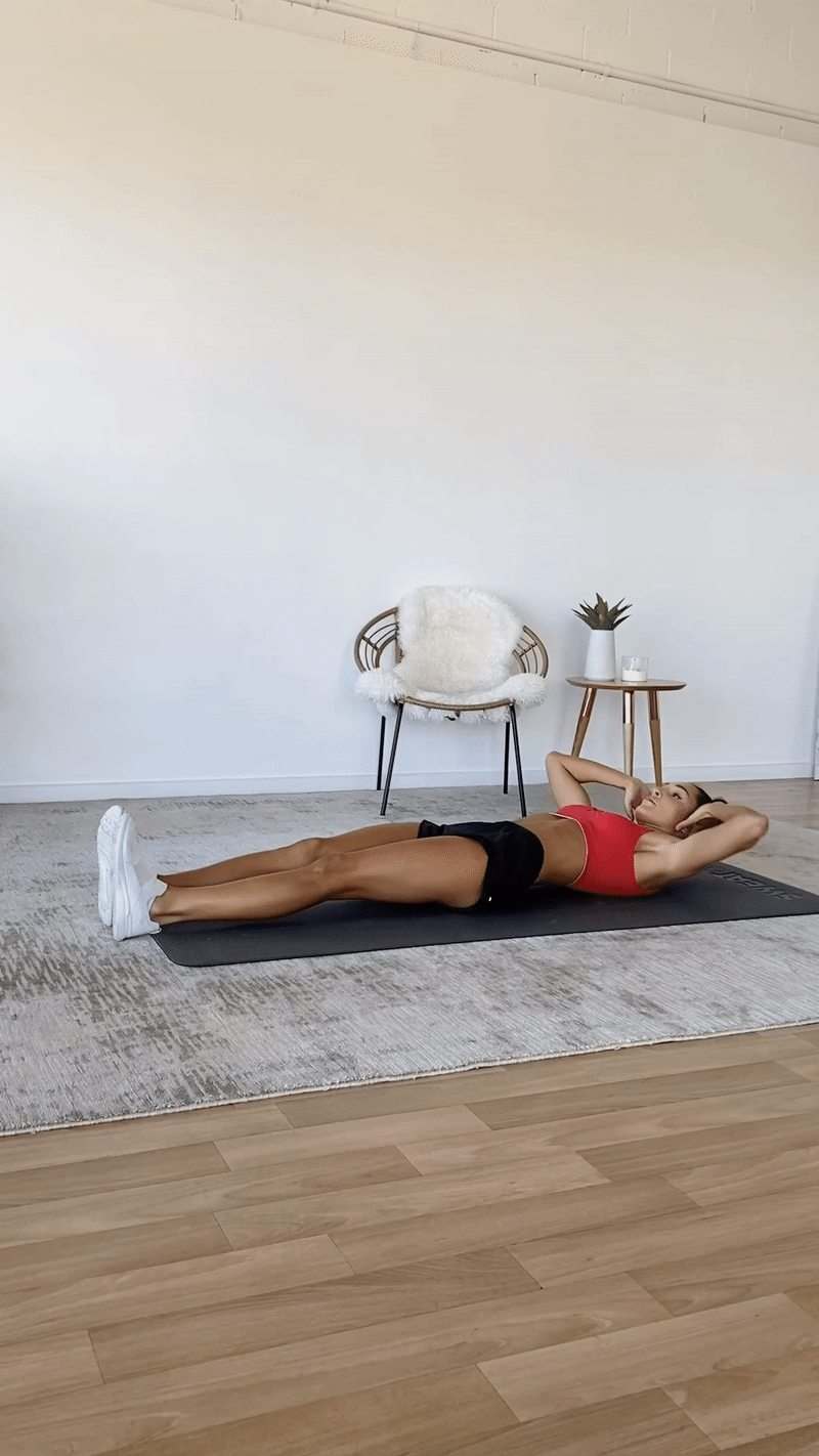 - Start by lying straight on your back on the floor, with both arms extended above your head. Place both hands behind your earlobes. Engage your abs by pulling your belly button towards your spine. This is your starting position.