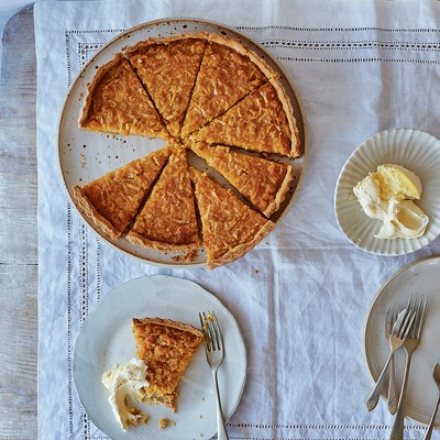 Golden syrup deliciousness and the sweeter the better, this is a favourite pudding in our house. It brings back memories of my childhood and treacle tart for Sunday lunch, as this was always one of my mother’s signature puddings. The right balance of syrup to crumbs is essential here. Not enough and the filling will be dry and chewy; too much and it will not set. Another method I love to use, which my grandmother always swore by, is to grate the pastry into the tin and then pat the pastry out with your hands to line the tin. Always handle pastry with care and do not overwork. If time is an issue, ready-bought pastry from supermarkets really is good. If you do not have ceramic baking beans, rice is a perfect replacement. Any leftover pastry can be used to make jam tarts.