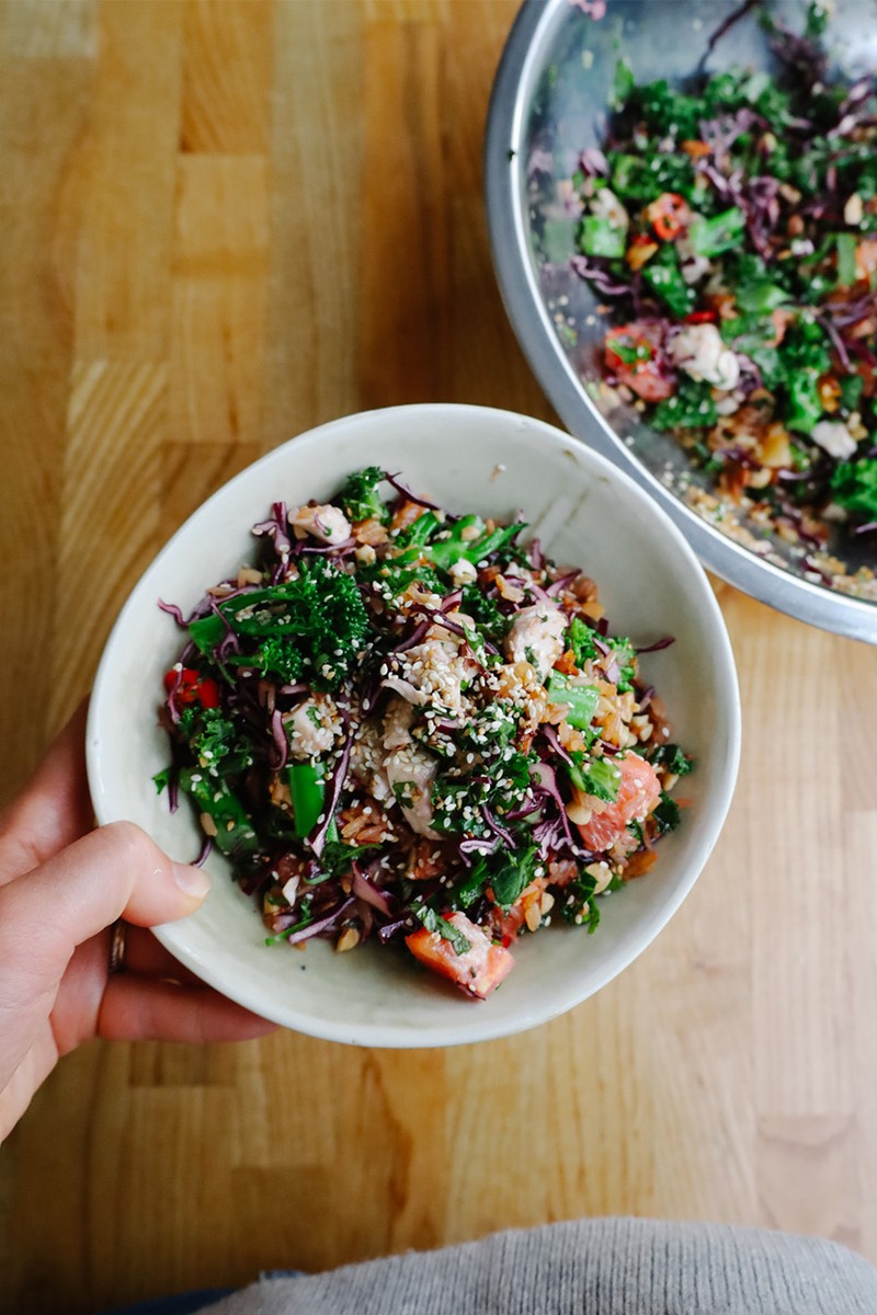 I ate a lot of really good salads when I was last in New York and my favourite was a chopped chicken salad that featured crispy rice. The chicken was cooked in a sticky orange marinade and the rice landed somewhere between a crunchy crouton and chewy caramelised bacon enriched with meaty stock and sweet maple. This is my own version. The chicken is plain, meaning you can toss in any leftovers from a Sunday roast or poach it beforehand. I’ve added lots of shredded veg and three types of citrus. If you’ve never crisped your rice for a salad before, believe me when I say it’s worth it.