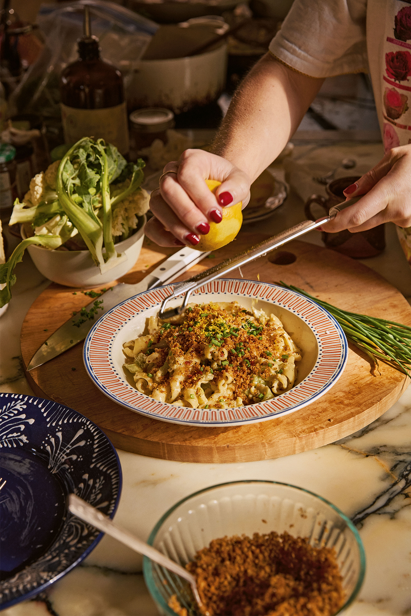This recipe is wonderful for many reasons: a whole head of cauliflower caramelises in a pan before being simmered with cream, black pepper, pecorino cheese and a bit of lemon zest, breaking down into a special (and yes, decadent) sauce to coat the pasta shape of your choosing. It’s the pecorino breadcrumbs we’re here for and that’s okay – they’re magnificent. A crunchy, oily, salty vehicle for more cheese and much-needed texture, they’re the ideal finish to a saucy pasta such as this but don’t stop there. Use them as tiny croutons to finish a caesar salad or scatter them over the top of a pot of saucy beans. Once they’re in your life, you’ll never want to be without them.