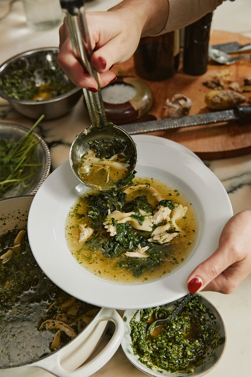 When I’m not feeling well, I want to combine the things that make me feel best: chicken noodle soup and lots of ginger and greens. This soup does that, heavy on both the ginger and the greens, and yes… it heals me. I like the noodles here to either be very large, behaving almost like a dumpling (an excellent use for those oft-maligned bow ties), or something very small that can crowd onto your spoon (ditalini, fregola or cooked rice). As for the greens (kale, Swiss chard, spinach), you really want them to cook down in the soup, going from bright green to almost olive green in colour and taking on the softened texture of braised or stewed greens. This way, they almost melt into the broth, becoming the most tender, sweet versions of themselves. Finally, the ginger – spicy and very much alive – gets added both to simmer in the broth and to finish on top, keeping the soup perky and restorative. If this doesn’t heal you, I don’t know what will.