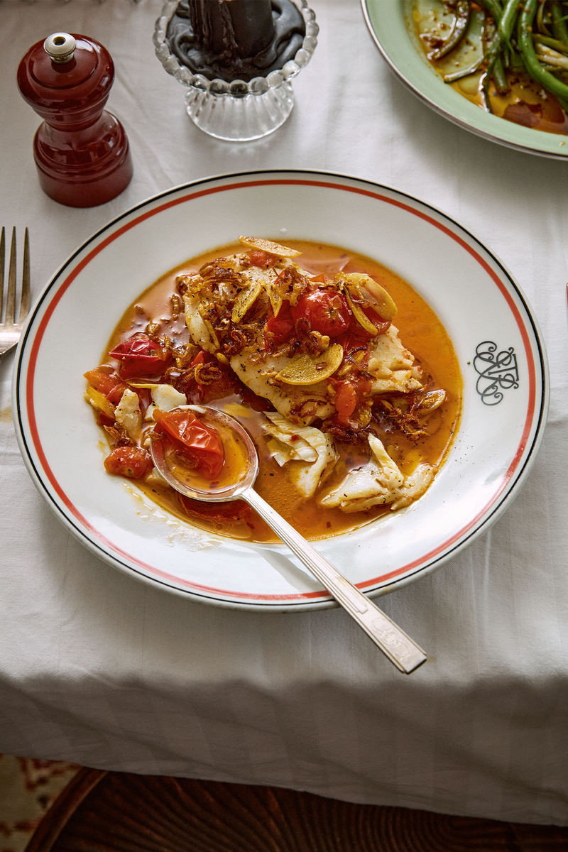 Poaching boneless, skinless, mild fish fillets in a flavourful, brothy sauce is not just my favourite way to cook fish but also the easiest method with the highest success rate among those who say ‘I’m afraid to cook fish.’ A ‘flavourful, brothy sauce’ can mean any number of things but I find the best, most crowd-pleasing one is a bright, spicy, sweet tomato number. It starts with the beginnings of a very basic chilli oil, fresh or tinned tomatoes and a healthy splash of fish sauce for added depth. The broth should be bold enough to season the fish as it gently cooks but not so punchy that you can’t drink it by the spoonful afterwards. While this could be turned into a sort of fish stew (cut your fish into bite-size pieces before cooking, and add prawns, clams or mussels), I would take advantage of this moment just to enjoy some fish on its own in a lovely little sauce.
