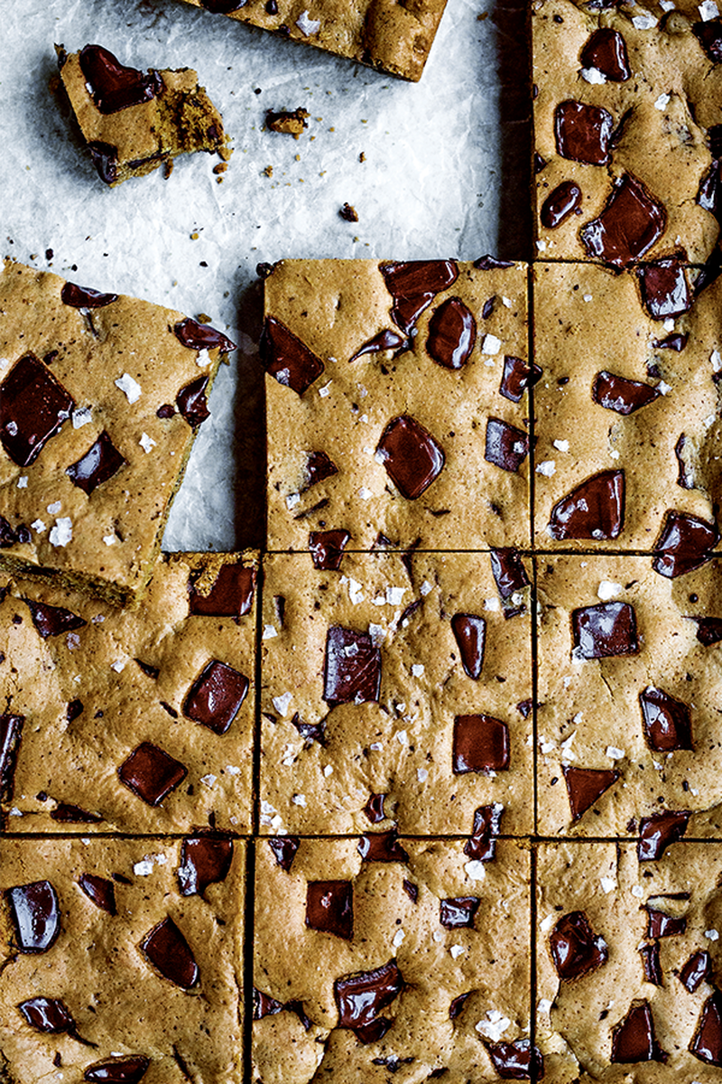 Chocolate chip cookies are a constant in my house, whether it is a batch resting in the freezer waiting for an emergency, or a batch of these cookie bars for when you want to skip the shaping and get these baked nice and fast – especially good for when friends come over unannounced. The tahini in this recipe adds a warm nuttiness that is more subtle than peanut butter, but adds a great depth of flavour that makes these bars really sing.