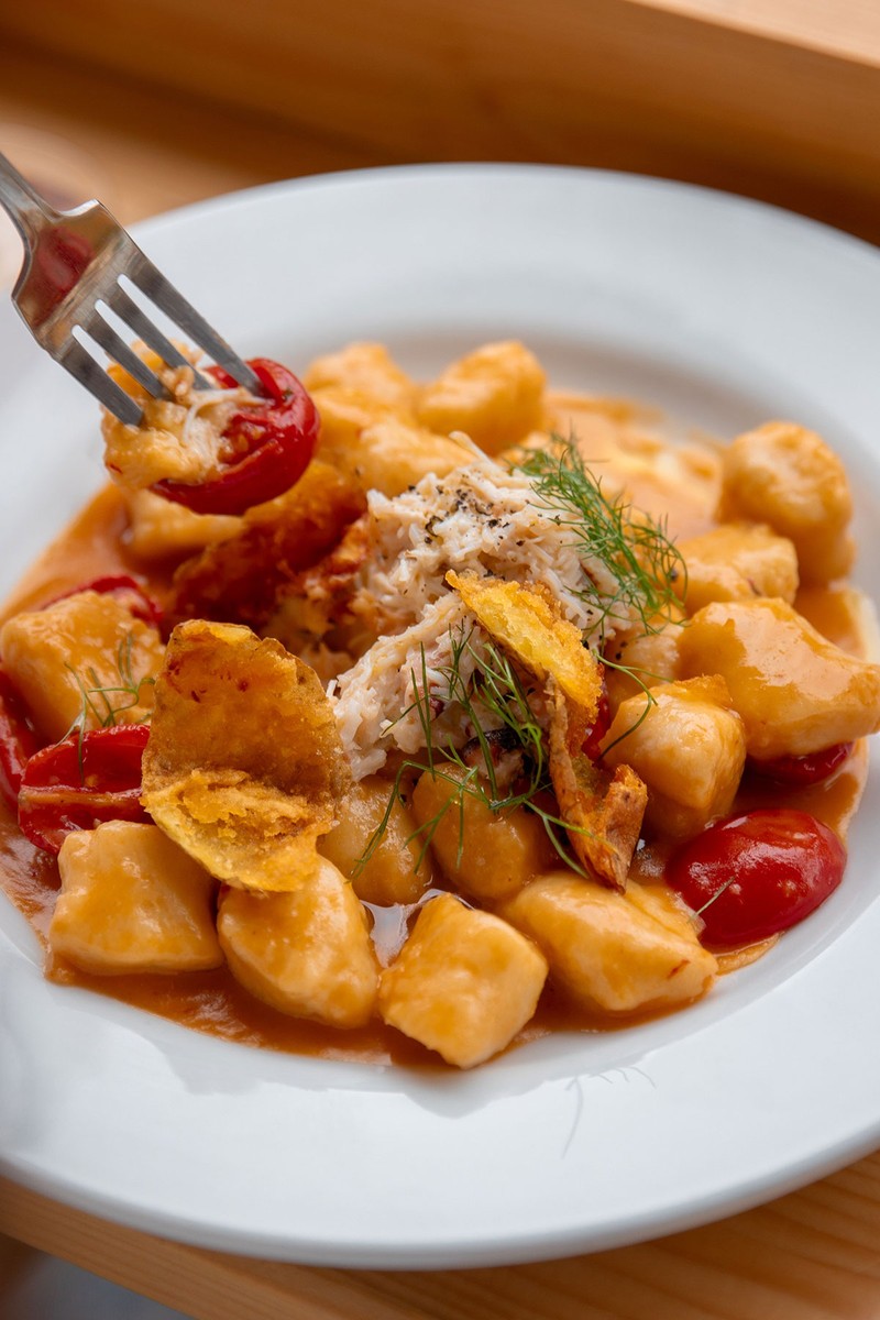 Warm the bisque, fold in the cooked gnocchi and roasted tomatoes. Just before serving, gently fold through the white crab meat to warm it through without overcooking.
