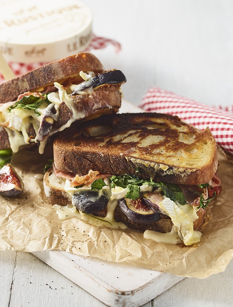 Build the toastie by layering on the prosciutto, half the sliced Le Rustique Camembert, fig slices, basil leaves and top with watercress.
