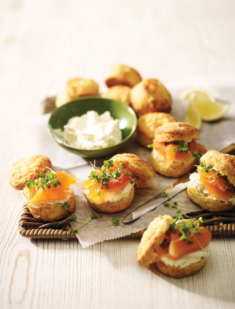 Split each scone in half, spread the base with soft cheese, top with a piece of smoked salmon and sprinkle over some cress before replacing the top. Serve with small wedges of lemon for squeezing over the salmon.