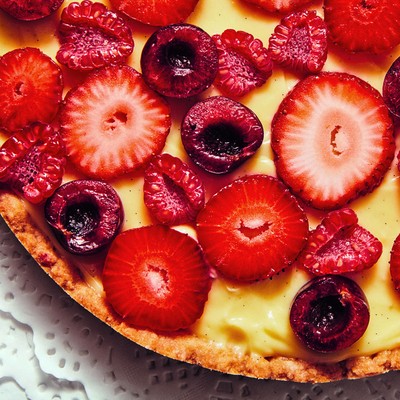 Top with fruit of your choosing; for the simplest version, use lovely uncooked berries, preferably all from the same colour family. Strawberries thinly sliced crossways to expose their circular core, raspberries either left whole or cut in half, redcurrants if you can find them.
