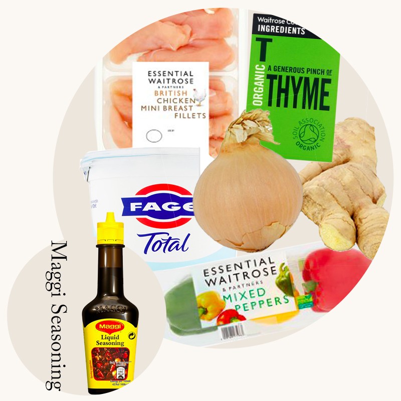 3.On a large tray, lay out the chicken, peppers and onion. Slosh with olive oil and season the veg. Bake or chargrill for 30 minutes until it’s cooked through. Taste when cooked and season further if you wish. Serve with the yoghurt dressing.