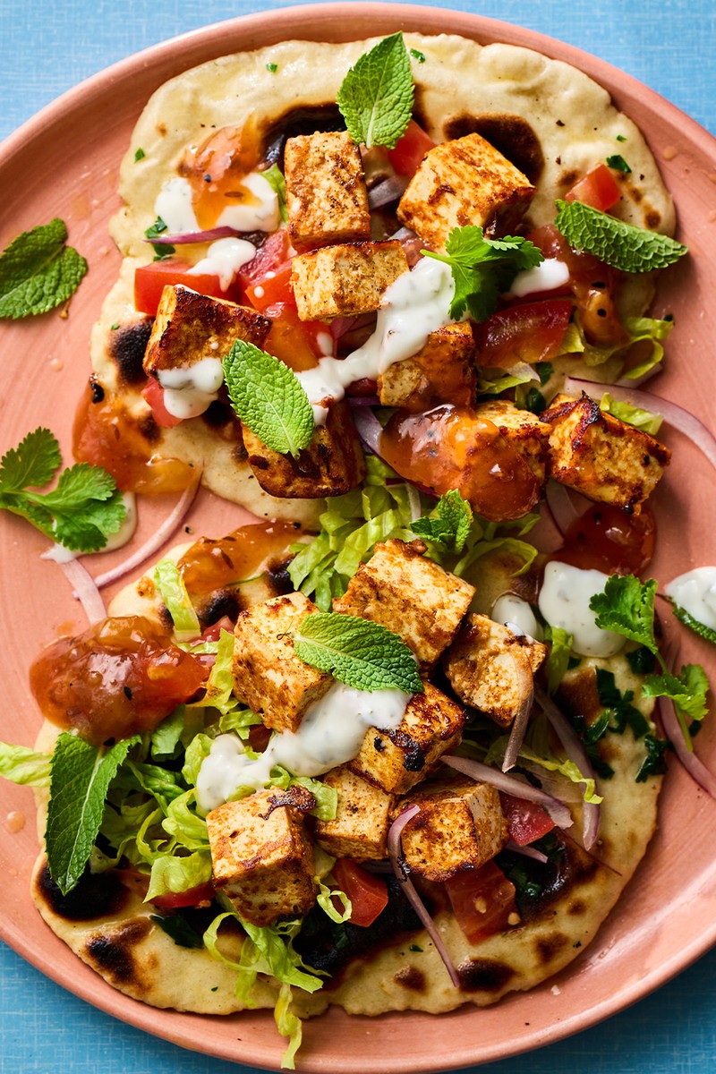 If you’re looking for a Friday ‘fakeaway’ with a bucket-load of flavour that will help you hit your protein goals, this is it. Crispy, tikka-spiced tofu is piled onto a warm homemade, high-protein garlic and coriander naan and finished off with all the good stuff.