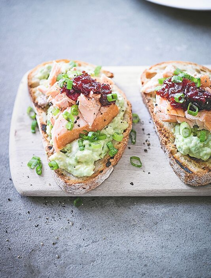 Scatter over the flaked salmon and salad onions, then top with the chilli jam to serve.
