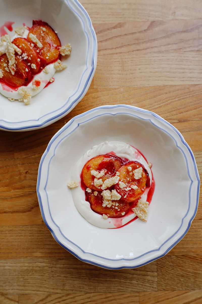 Baked Plums With Tahini Cream & Crushed Sesame Snaps
