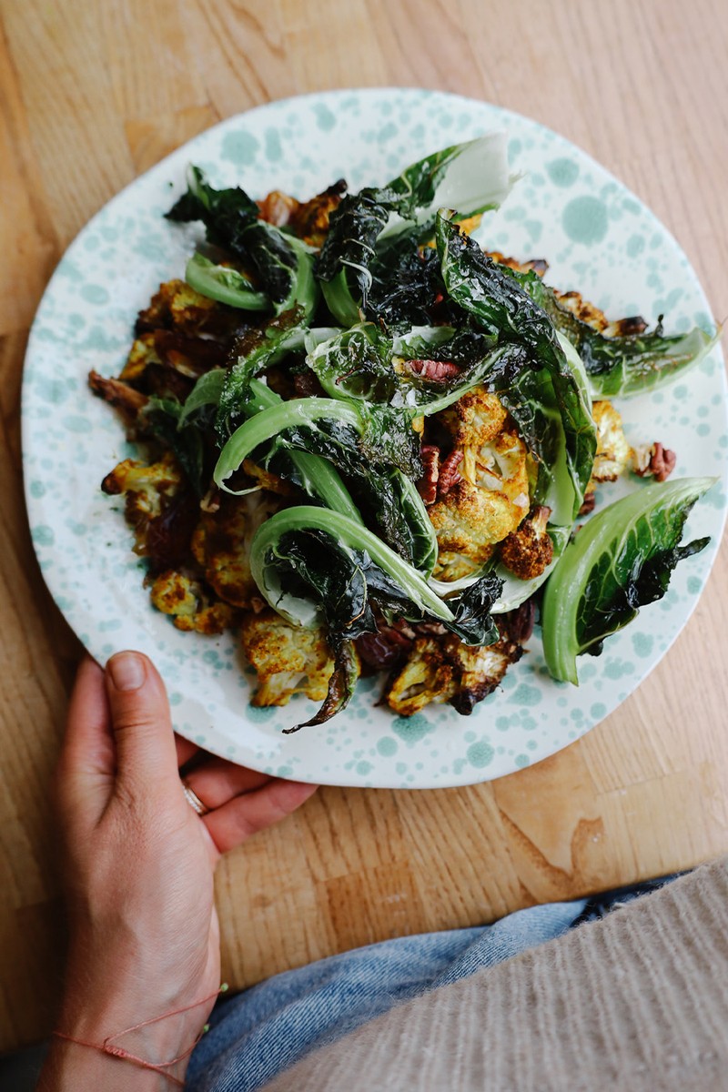 Spoon the tahini onto a plate, top with the cauliflower, pecans and dates, a good drizzle of olive oil, and the crunchy roasted cauliflower leaves. Finish with lemon juice and a pinch of flaky sea salt.