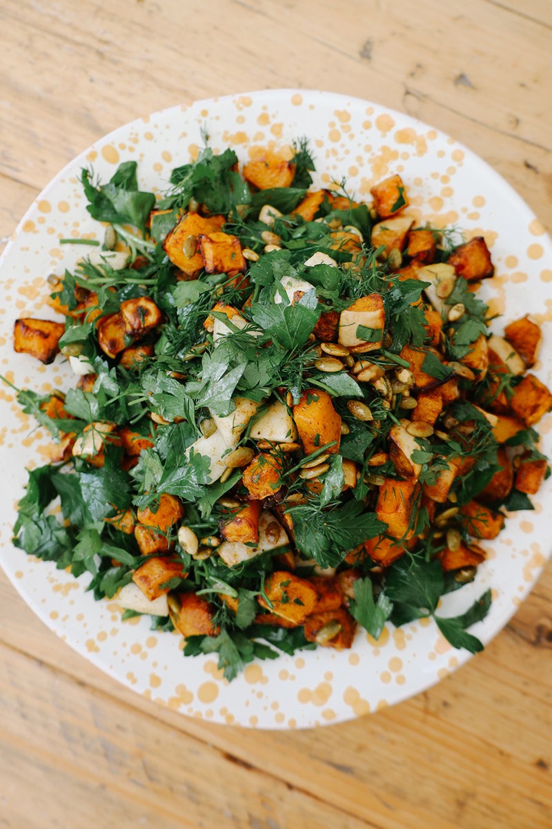 Add the squash, pear, chopped herbs, toasted seeds with the lemon juice (start with the juice from just ½ first), a pinch of salt, and a good glug of olive oil. Taste for seasoning, adjusting as you wish, and transfer to a serving dish.