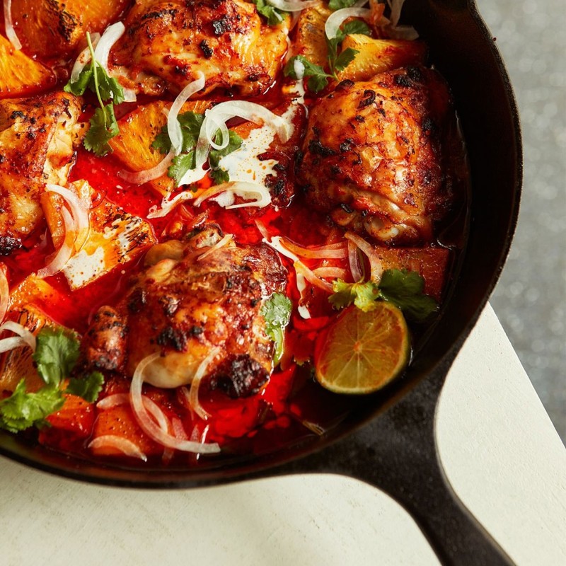 Put all the ingredients for the paste into a large bowl and mix together. Add the chicken, garlic and three-quarters of the sliced onion and mix well so everything is coated evenly. Tip the onions and garlic into a 28cm ovenproof cast-iron skillet or similar-sized baking dish and spread out. Place the chicken thighs on top, skin side up and spaced apart.