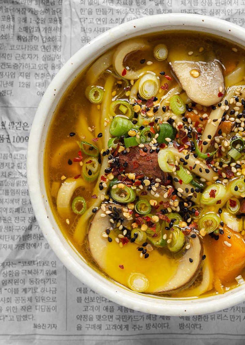Once the sweet potatoes have finished cooking, spoon into the pan with the broth and add the cooked noodles. Stir well until everything has mixed through, before spooning into bowls and topping with the rest of the spring onions.