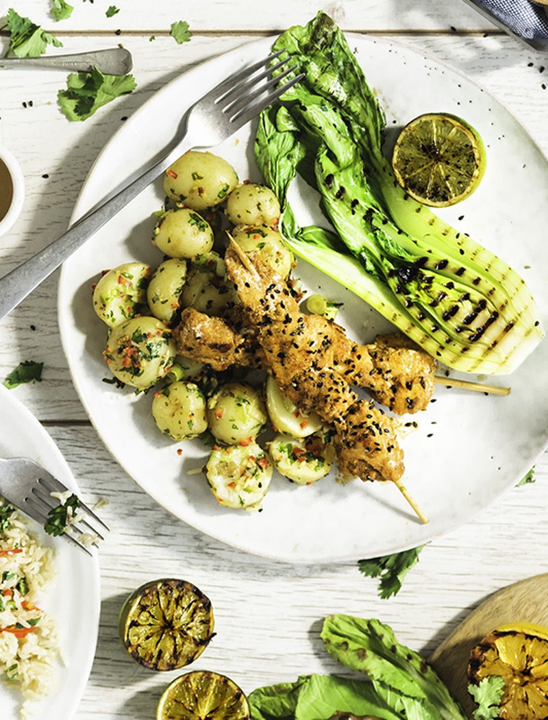 Spoon the spicy potatoes onto two warm plates, top with the monkfish skewers. Sprinkle over the black sesame seeds and serve with the remaining juice from the lime.