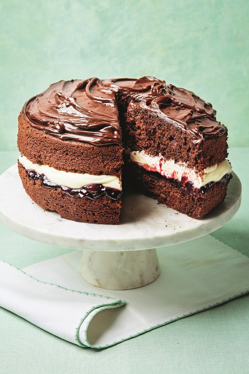 Place one of the cakes upside down on a board. Spread the cherry jam over the surface and top with the whipped cream. Place the second cake on top. Spread the ganache icing over the top of the cake and swirl to make a pretty design.