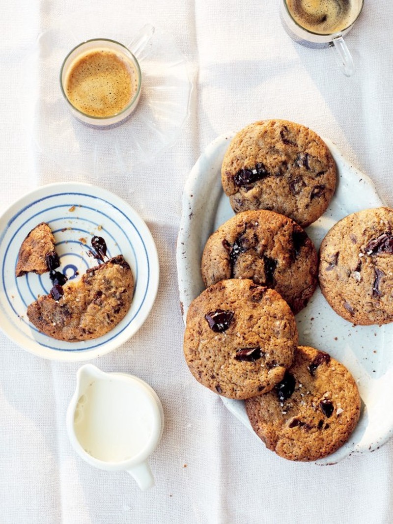 Beat together the butter, both sugars and sea salt flakes in a large bowl with an electric whisk for 4-5 minutes until creamy, pale and smooth (or beat by hand with a wooden spoon if you’re feeling strong). Beat in the egg, coffee and vanilla and mix again (don’t worry if it looks split at this stage). Tip in the flour and baking powder and mix until you have a thick, pliable mixture. Fold in the dark chocolate.