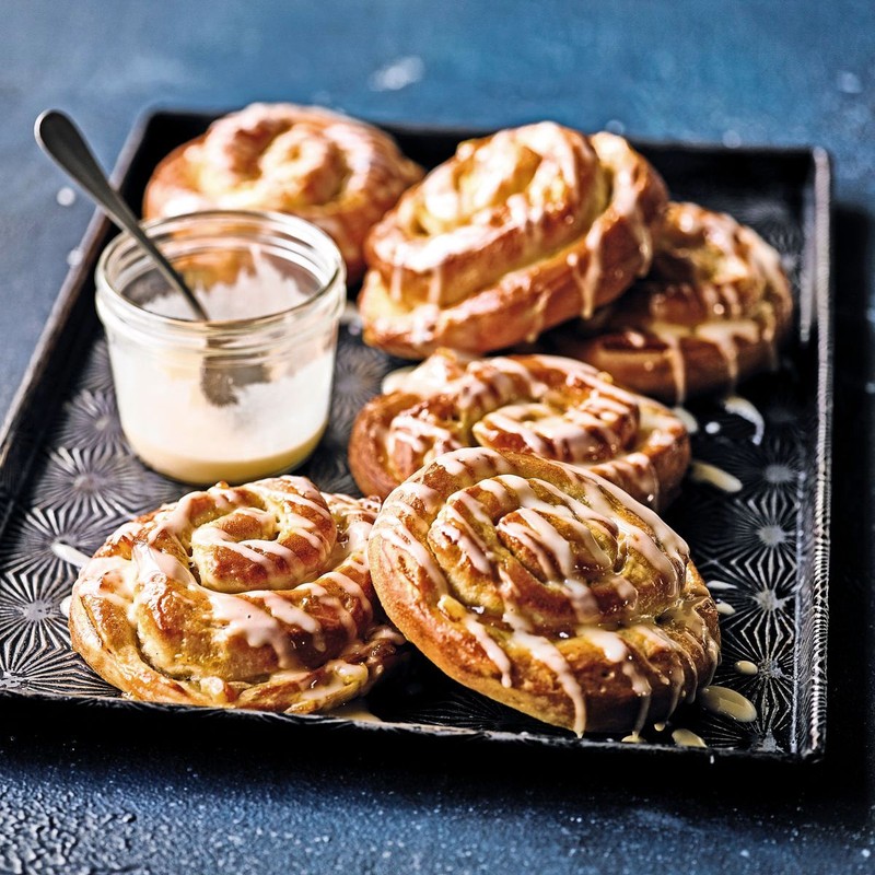 When the dough has risen, turn it out onto the oiled surface and fold it in on itself a couple of times to knock out any large air bubbles. Roll the dough out into a large rectangle approx 40 x 20cm, around twice as long as it is wide. Spread the soft butter all over the dough, then top with the 3 tbsp of marmalade. Tightly roll the dough, starting from one of the shorter sides, then cut into 10 slices and put on a baking tray with enough space for them in a single layer to double in size. Cover the rolls with oiled clingfilm and leave for at least 45 minutes, or until doubled in size (you can also put the buns in the fridge overnight at this stage, to bake fresh for breakfast).