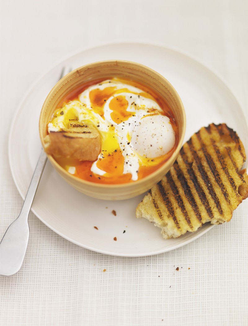 Place two eggs into each bowl of yogurt. Drizzle the butter over the egg and yogurt and serve with sourdough bread.