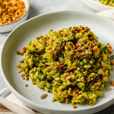 Pea, Spinach & Asparagus Risotto With A Granola Crunch