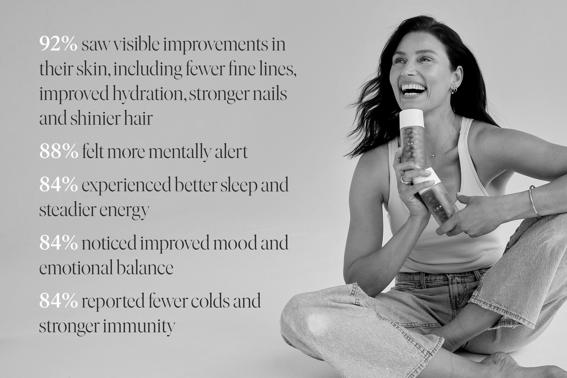 Unlike many wellness products, Lumity doesn’t just promise results – it’s been clinically tested in a placebo-controlled, double-blind study on women aged 35 to 65. It’s rare to see results that span so many areas – and it’s what makes Lumity such a compelling upgrade to your wellbeing routine. After just 12 weeks, the results spoke for themselves: