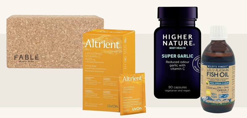 Supplements keep me on track. Every day, I take 1000mg of Peak EPA omega-3, a fantastic form of fish oil that is clinically proven to increase omega-3 levels in the body. I also swear by Oskia’s Pure MSM – it’s a naturally occurring, organic sulphur compound that supports collagen, keratin and glutathione production to support skin health and the immune system. I also take vitamin C, a combined calcium and magnesium, and garlic capsules.